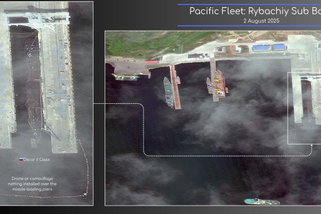 Russia has installed anti-drone nets over a nuclear-powered submarine and parts of the pier at its Rybachy base in Kamchatka, according to satellite analysis reviewed on August 2. The development was identified by